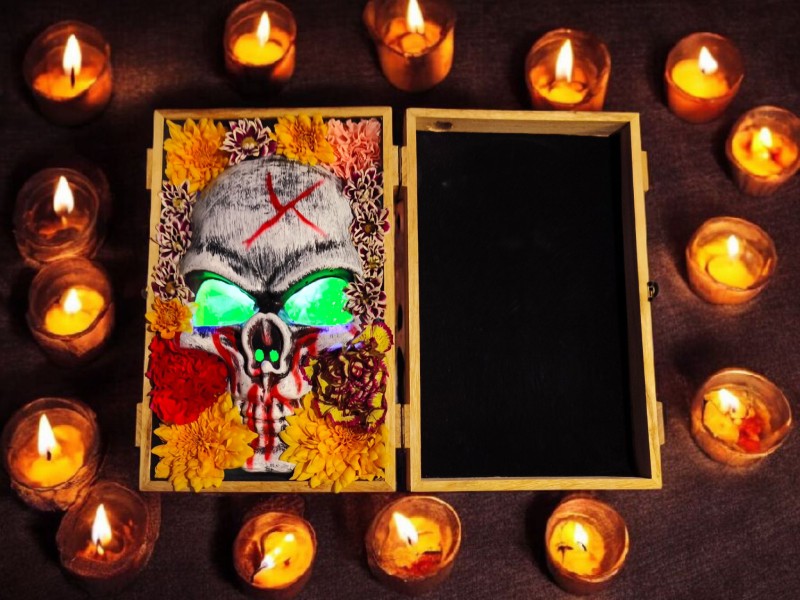 Nuestra copa descansa dentro de una caja de madera, custodiada por flores frescas y la máscara de catrina, mientras el humo con aroma a tabaco habano llena la sala como si fuera un pequeño gran truco de magia, creando un instante de ritual y misterio antes de su revelación.