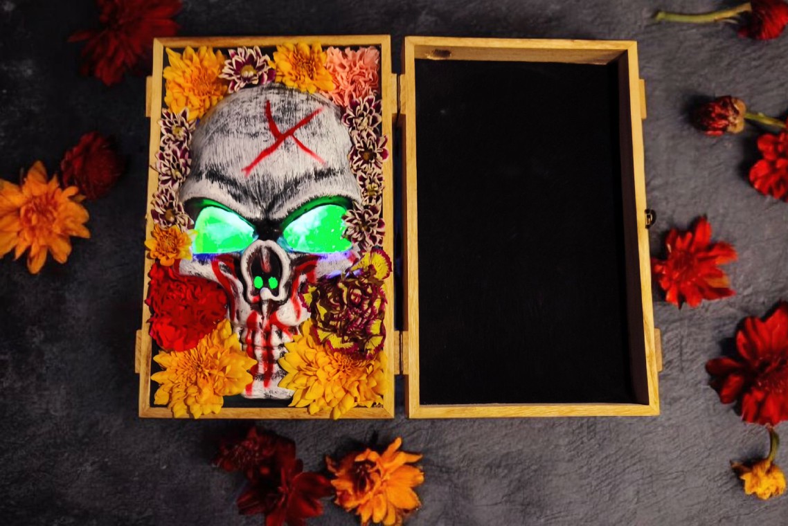 Nuestra copa descansa dentro de una caja de madera, custodiada por flores frescas y la máscara de catrina, mientras el humo con aroma a tabaco habano llena la sala como si fuera un pequeño gran truco de magia, creando un instante de ritual y misterio antes de su revelación.